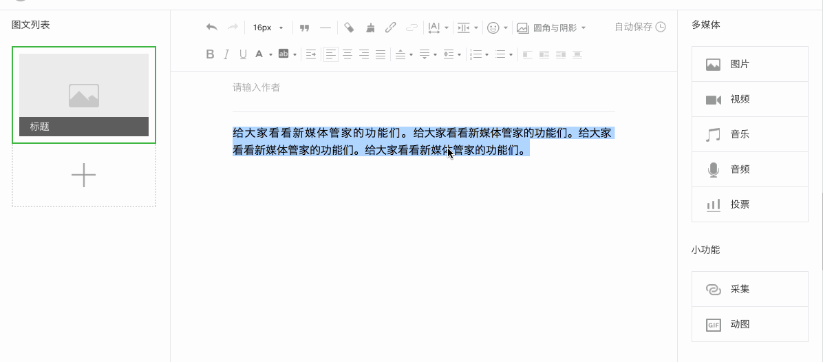 可以使用“采集文章”功能,一次性将转载文章、封面图、摘要和标题收入公众号后台。 ③排版省时间 第三件事,是写作排版。 文字排版