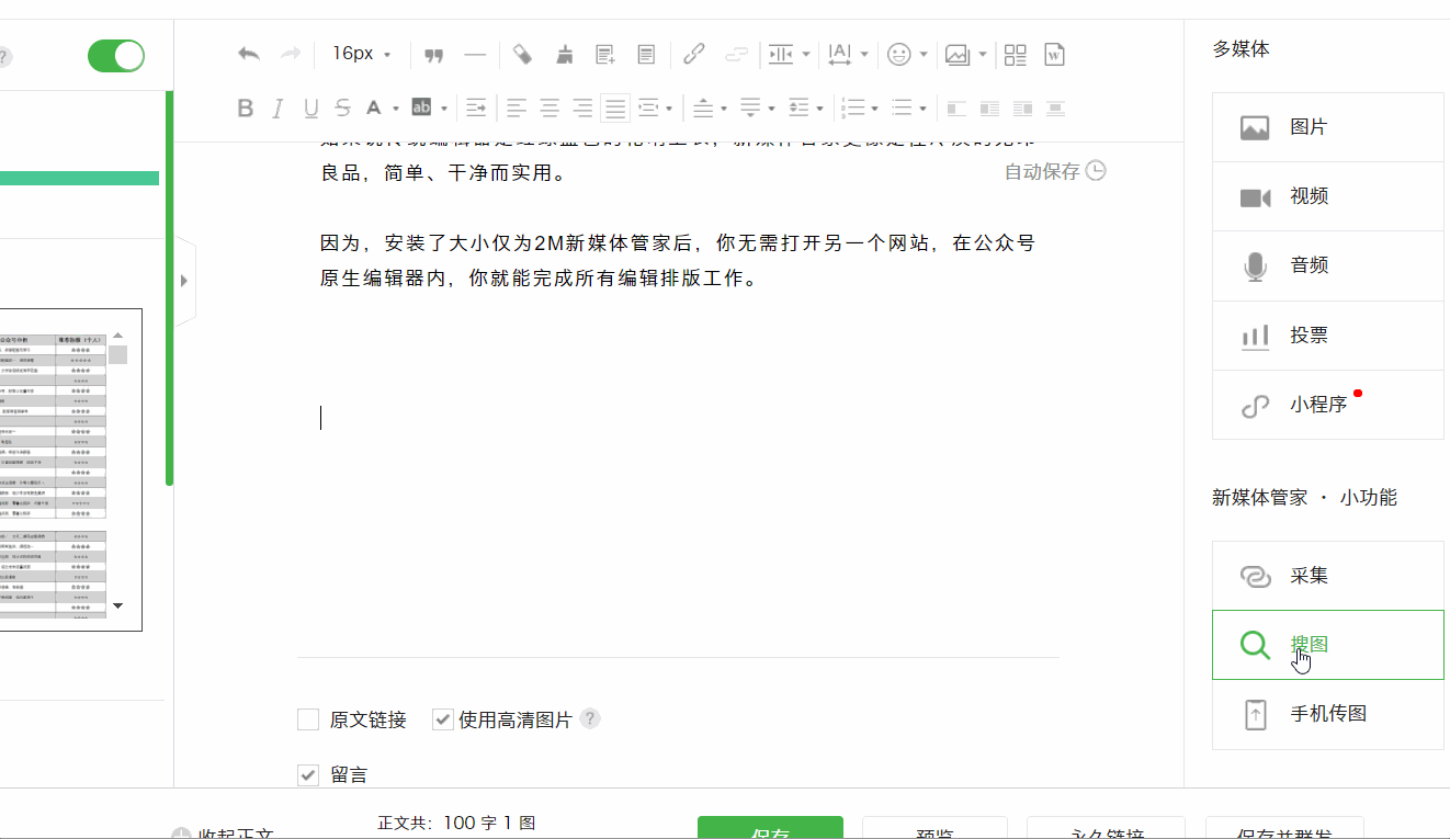 这就好比,写作的时候,一个满是红点、不断冒出微信消息的手机摆在你面前,还想专心写作吗?很难。 ▌新媒体管家 如果说传统编辑器是花哨卫衣,新媒体管家更像是性冷淡的无印良品,简单、干净而实用。