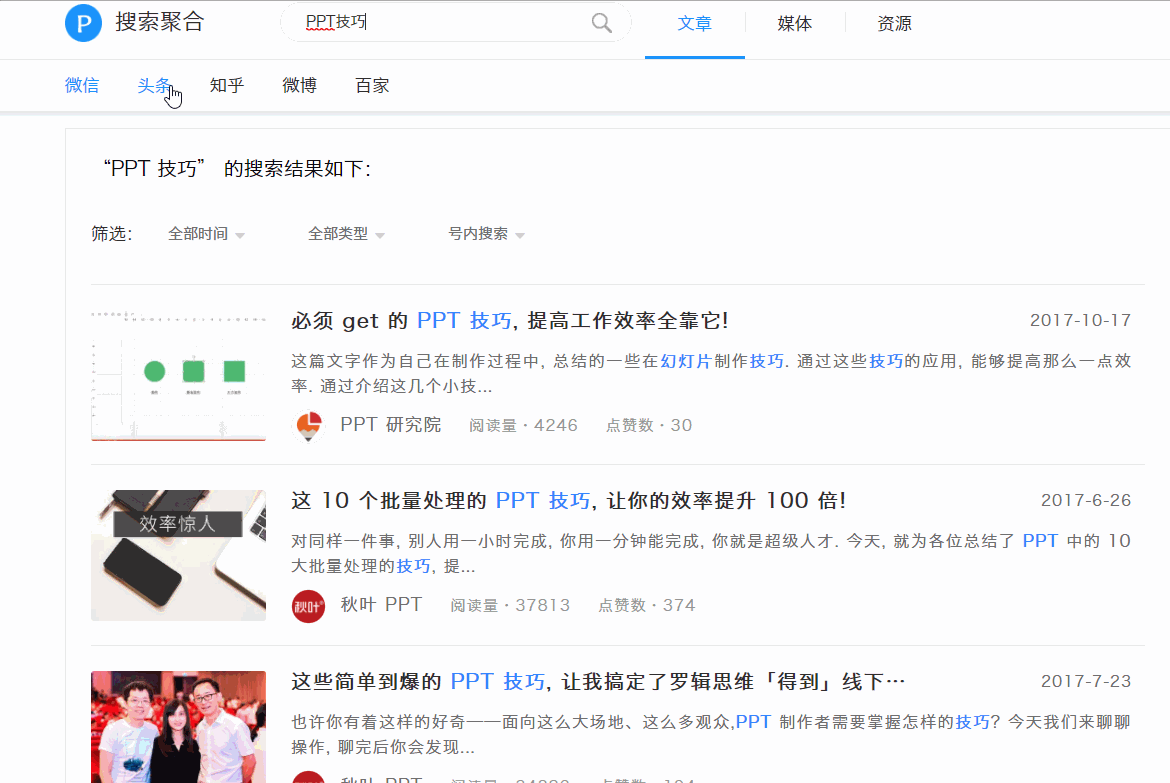 可以搜索关键词查找。比如我搜“PPT技巧”,一次性在微信、微博、知乎、头条上,搜集高阅读、高点赞数的文章,作为素材参考。 如果你想转载文章